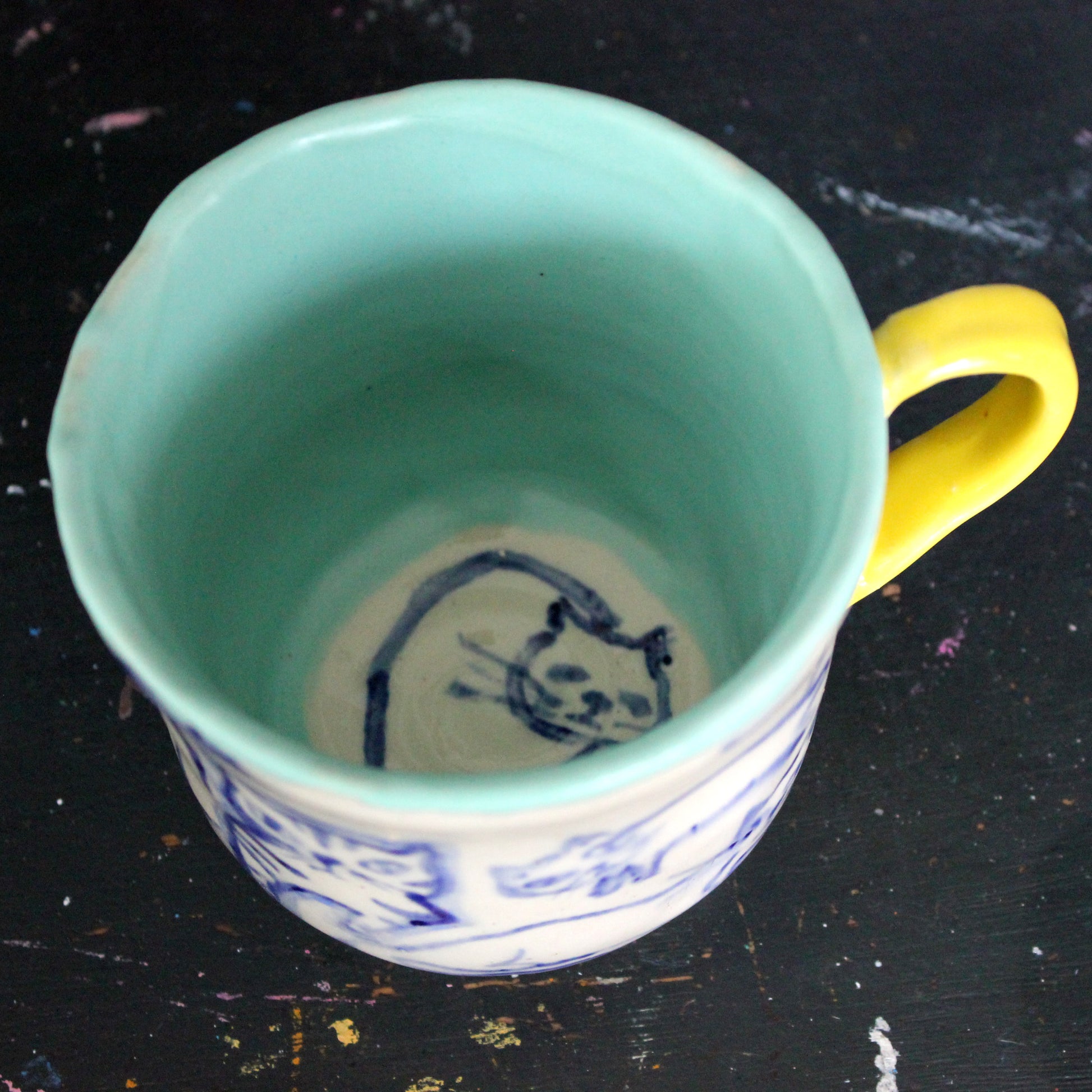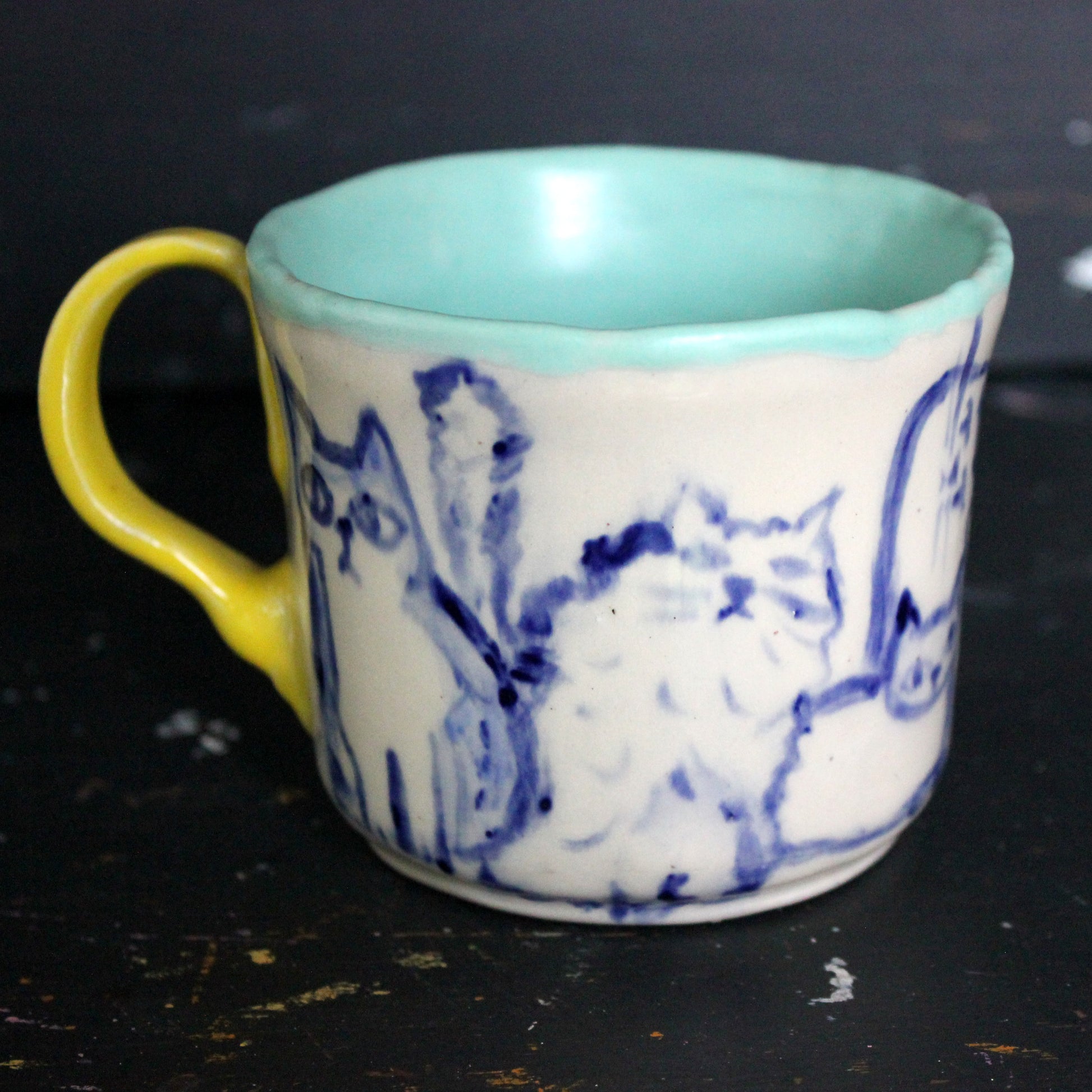 This cheerful mug is full of feline attitude — a crowd of hand-drawn cats in cobalt blue wrap around the sides, with one more surprise kitty waiting inside. The yellow handle adds a bright pop, while the soft mint glaze inside brings calm contrast. The slightly irregular rim adds to the handmade charm and feels comfortable in the hand.
