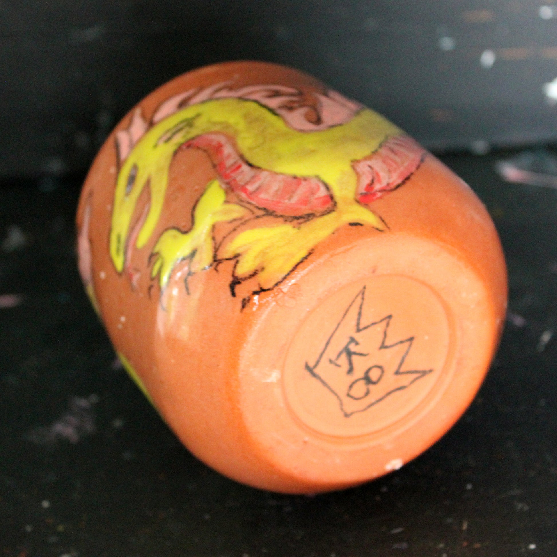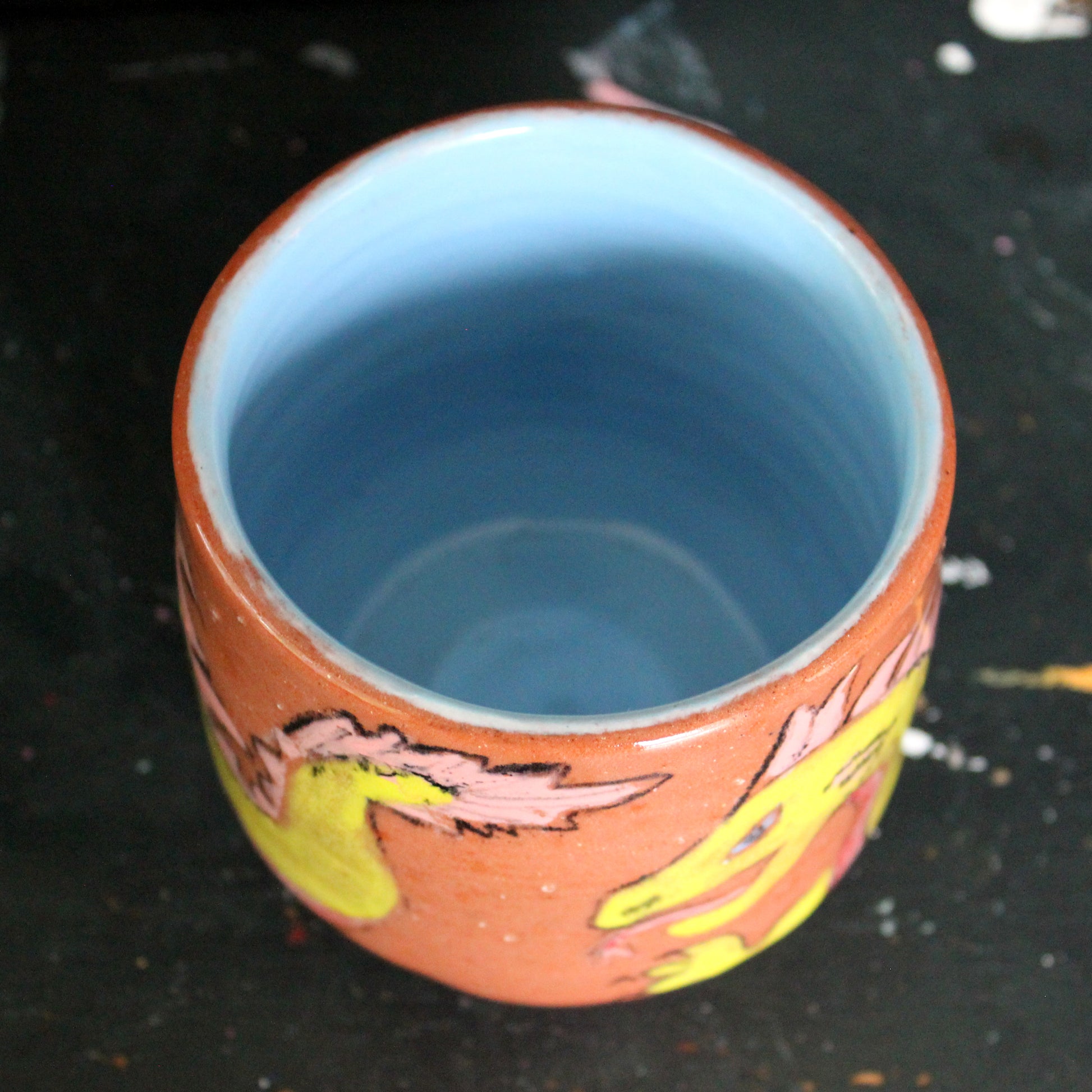 This one-of-a-kind ceramic tumbler features a hand-drawn dragon — bright yellow with pink spines — wrapping around a warm terracotta surface. The inside is glazed a dreamy sky blue, making every sip feel a little magical.